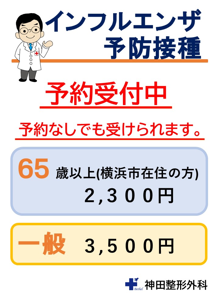インフルエンザ予防接種について 投稿日:2025.10.17 インフルエンザ予防接種のご案内 2025年度インフルエンザ予防接種を開始しております。 インフルエンザ予防接種ご希望の方は、ご予約をお願い致します。 電話でのご予約も受け付けております。 TEL:045-933-7888 また予約なしでも受けられます。 公費 2,300円(横浜市在住65歳以上の方) 一般 3,500円(自費・税込)